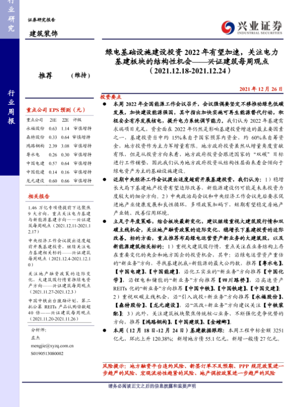 【兴业证券】【20211226】绿电基础设施建设投资2022年有望加速,关注电力基建板块的结构性机会-41页 行业研究
