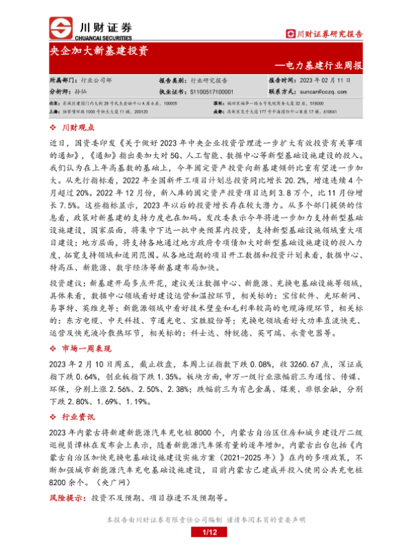 【川财证券】【20230211】电力基建行业周报:央企加大新基建投资-12页 行业研究