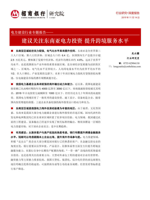 【招商银行】【20191114】电力建设行业专题报告:建议关注东南亚电力投资 提升跨境服务水平-25页 行业研究