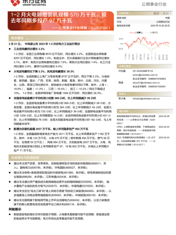 【东方证券】【20230328】公用事业行业周报:1~2月火电新增装机规模570万千瓦,较去年同期多投产97万千瓦-15页 行业研究
