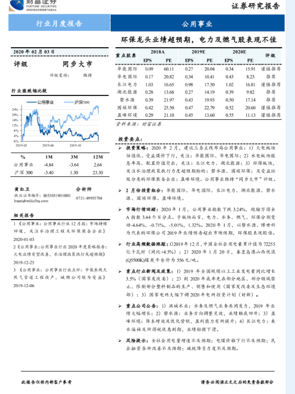 【财信证券】【20200203】公用事业行业月度报告:环保龙头业绩超预期,电力及燃气股表现不佳-12页 行业研究