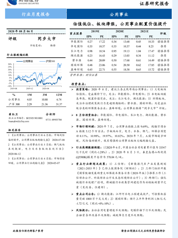 【财信证券】【20200806】公用事业行业月度报告:估值低位、板块滞涨,公用事业配置价值提升-10页 行业研究