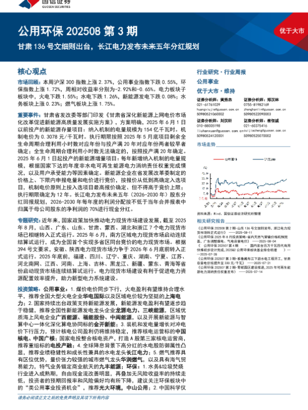 【国信证券】【202508】公用环保行业202508第3期:甘肃136号文细则出台,长江电力发布未来五年分红规划-29页 证券期货研究报告
