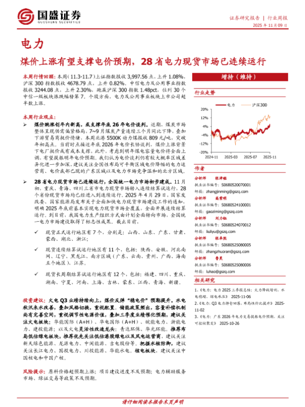 【国盛证券】【202511】20251109-国盛证券-电力行业周报:煤价上涨有望支撑电价预期,28省电力现货市场已连续运行-13页 证券期货研究报告
