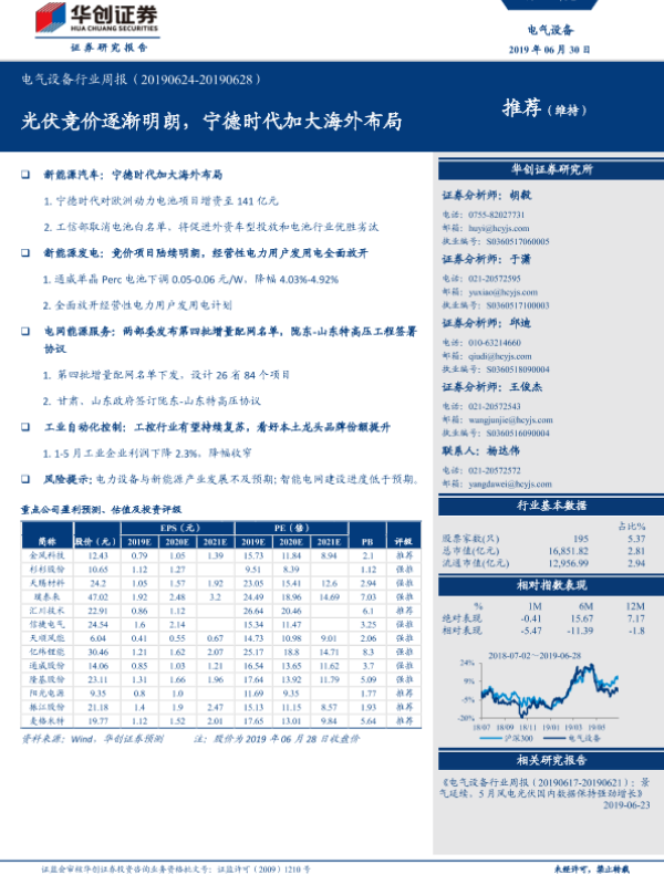 【华创证券】【20190630】电气设备行业周报:光伏竞价逐渐明朗,宁德时代加大海外布局-25页 行业研究