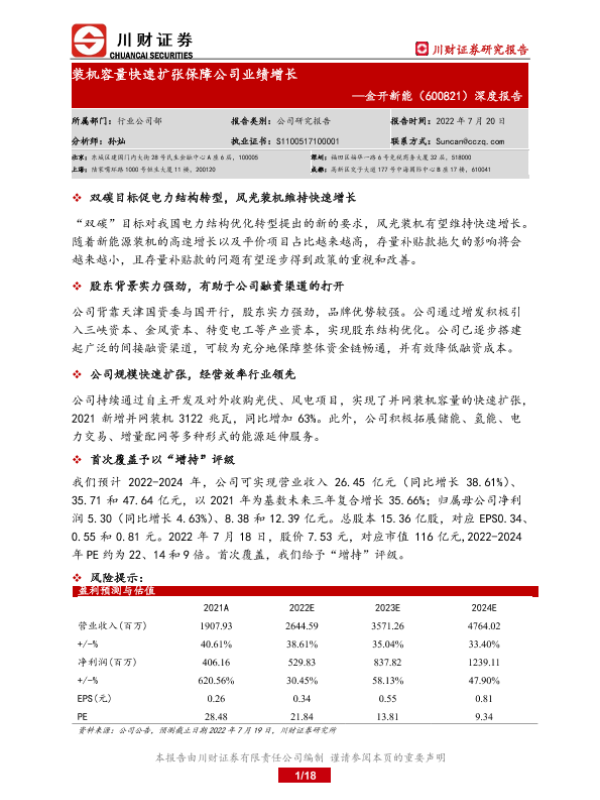 【川财证券】【20220720】金开新能深度报告:装机容量快速扩张保障公司业绩增长-18页 公司研究
