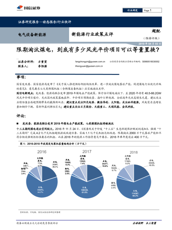 【国信证券】【20190403】新能源行业政策点评:限期淘汰煤电,到底有多少风光平价项目可以等量置换?-6页 行业研究