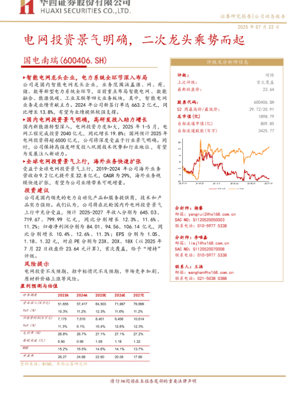 【华西证券】【20250722】国电南瑞(600406)电网投资景气明确,二次龙头乘势而起-12页 公司研究