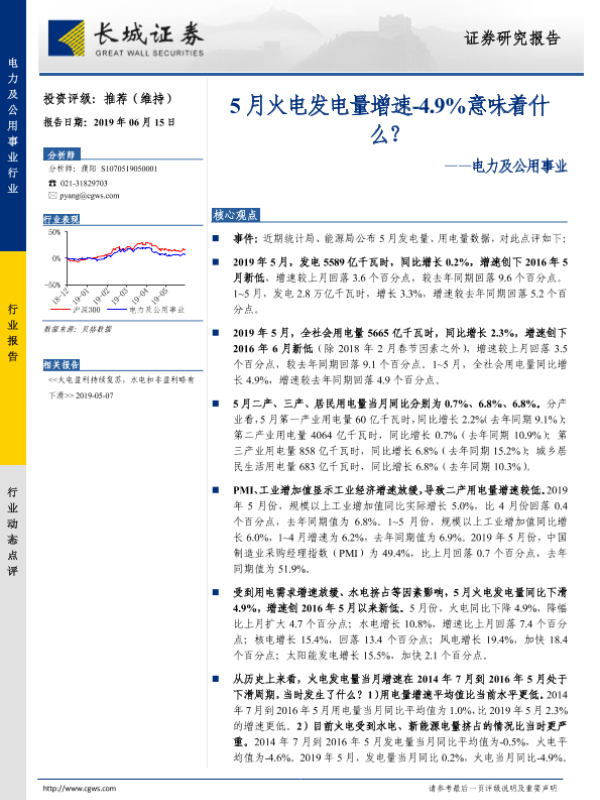 【长城证券】【20190615】5月火电发电量增速-4.9%意味着什么-6页 行业研究