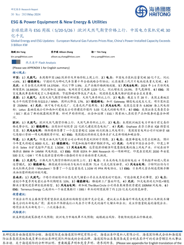 【海通国际】【20240530】全球能源与ESG行业:欧洲天然气期货价格上行,中国电力装机突破30亿千瓦-42页 行业研究
