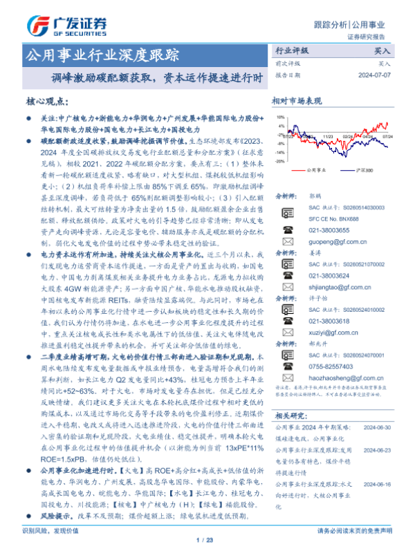 【广发证券】【20240707】公用事业行业深度跟踪:调峰激励碳配额获取,资本运作提速进行时-23页 行业研究