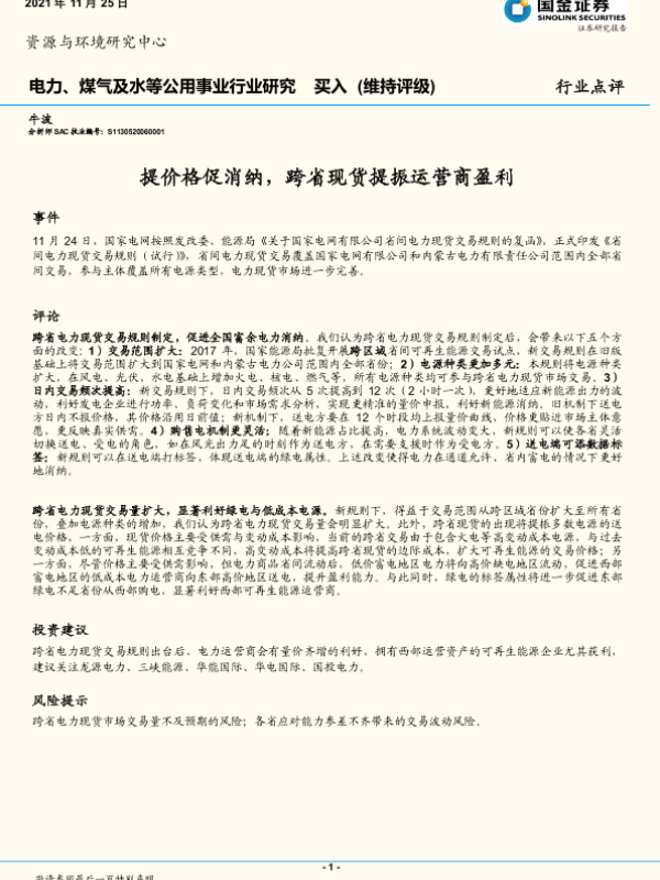 【国金证券】【20211125】电力、煤气及水等公用事业行业研究:提价格促消纳,跨省现货提振运营商盈利-3页 行业研究