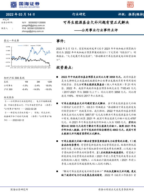 【国海证券】【20220314】公用事业行业事件点评:可再生能源基金欠补问题有望正式解决-12页 行业研究