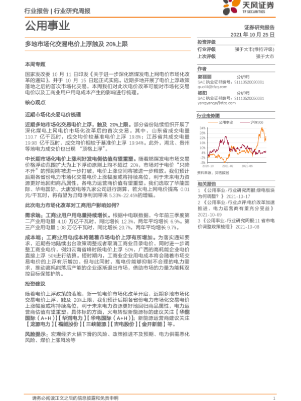 【天风证券】【20211025】公用事业行业研究周报:多地市场化交易电价上浮触及20%上限-14页 行业研究