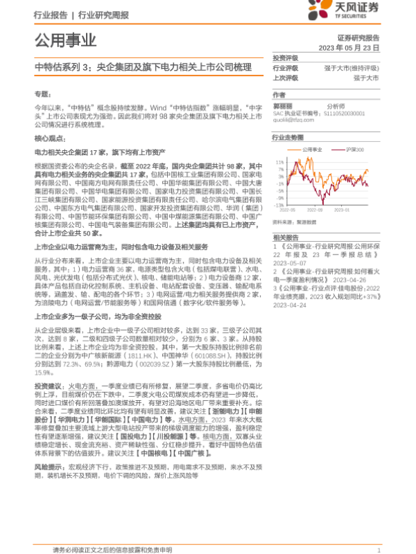 【天风证券】【20230523】公用事业行业研究周报:中特估系列3:央企集团及旗下电力相关上市公司梳理-13页 行业研究
