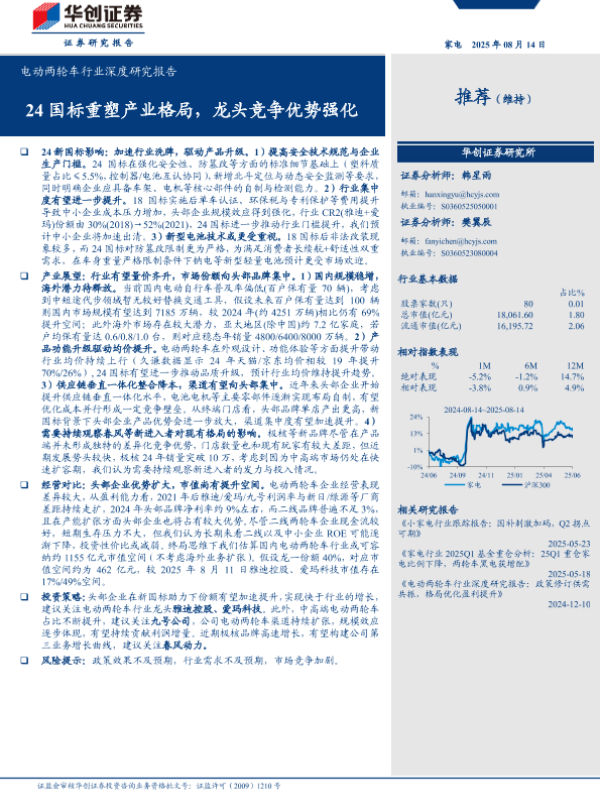 【华创证券】【202508】电动两轮车行业深度研究报告:24国标重塑产业格局,龙头竞争优势强化-32页 证券期货研究报告