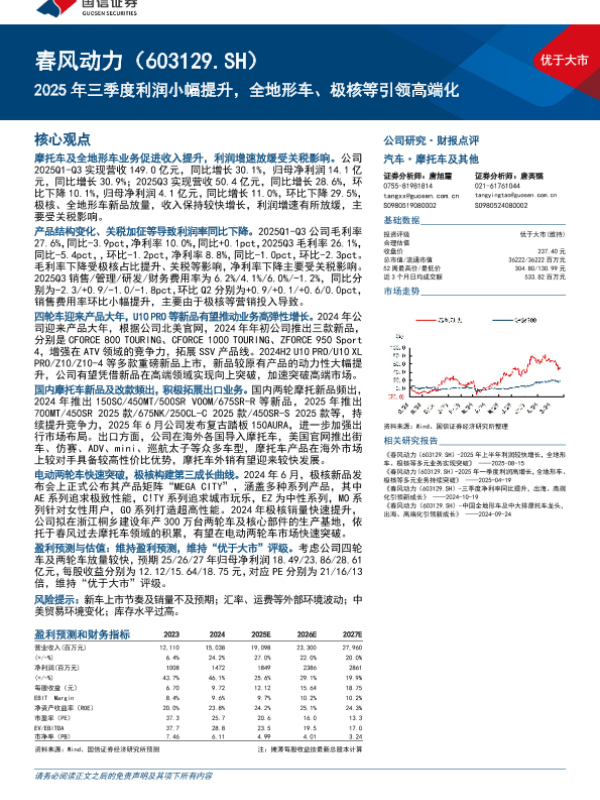 【国信证券】【202510】春风动力(603129)2025年三季度利润小幅提升,全地形车、极核等引领高端化-11页 证券期货研究报告