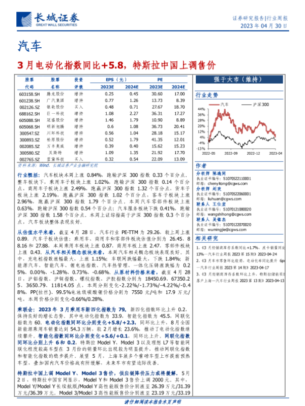 【长城证券】【20230430】20230430-长城证券-汽车行业周报:3月电动化指数同比+5.8,特斯拉中国上调售价-28页 行业研究