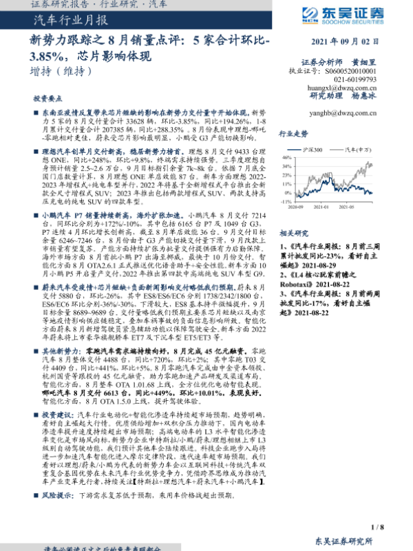 【东吴证券】【20210902】20210902-东吴证券-汽车行业月报:新势力跟踪之8月销量点评:5家合计环比-3.85%,芯片影响体现-8页 行业研究