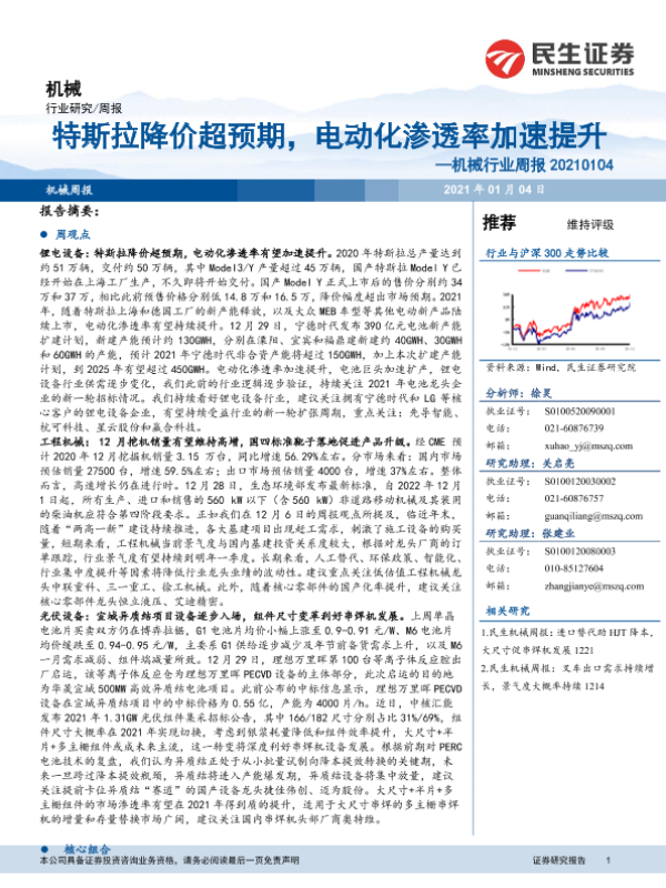 【民生证券】【20210104】20210104-民生证券-机械行业周报:特斯拉降价超预期,电动化渗透率加速提升-22页 行业研究