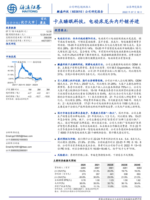 【海通证券】【20220718】20220718-海通证券-麒盛科技-603610.SH-公司研究报告:卡点睡眠科技,电动床龙头内外销并进-26页 行业研究