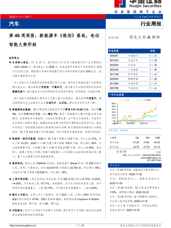 【华金证券】【20201108】汽车第46周周报:新能源车《规划》落地,电动智能大势所趋-15页 行业研究