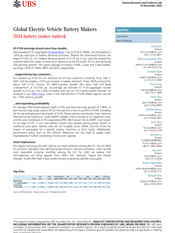 【UBS Securities Pte. Ltd.&Seoul Branch】【20231114】Global Electric Vehicle Battery Makers 2024 battery maker outlook-26页 行业研究