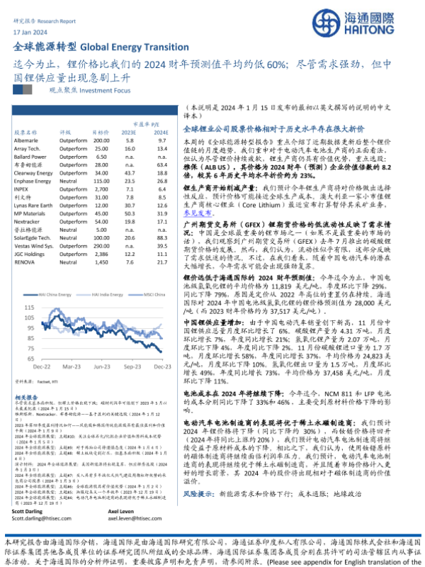 【海通国际】【20240117】全球能源转型:迄今为止,锂价格比我们的2024财年预测值平均约低60%;尽管需求强劲,但中国锂供应量出现急剧上升-17页 行业研究