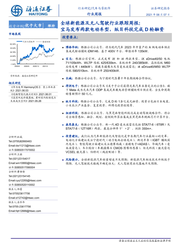 【海通证券】【20210607】全球新能源及无人驾驶行业跟踪周报:宝马发布两款电动车型,纵目科技完成D轮融资-2页 行业研究