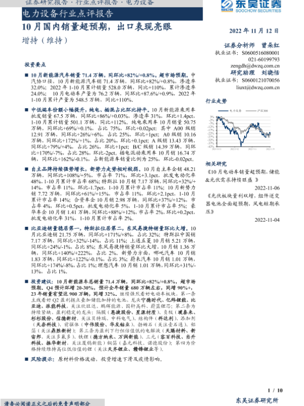 【东吴证券】【20221112】20221112-东吴证券-电力设备行业点评报告:10月国内销量超预期,出口表现亮眼-10页 行业研究