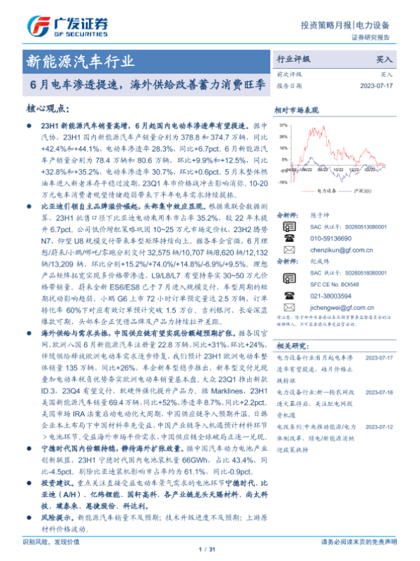 【广发证券】【20230717】20230717-广发证券-新能源汽车行业投资策略月报:6月电车渗透提速,海外供给改善蓄力消费旺季-31页 行业研究