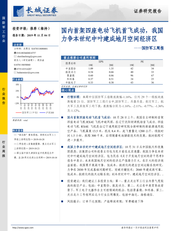 【长城证券】【20191104】20191104-长城证券-国防军工周报:国内首架四座电动飞机首飞成功,我国力争本世纪中叶建成地月空间经济区-19页 行业研究