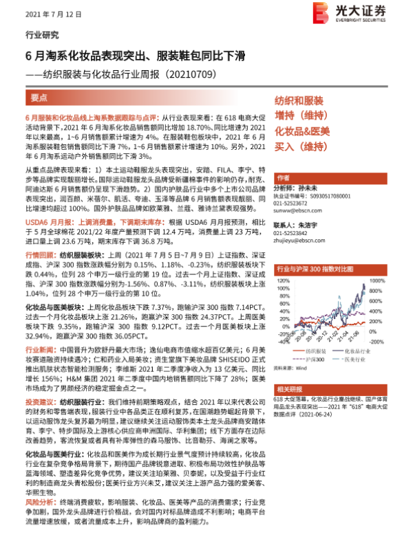 【光大证券】【20210712】20210712-光大证券-纺织服装与化妆品行业周报:6月淘系化妆品表现突出、服装鞋包同比下滑-15页 行业研究