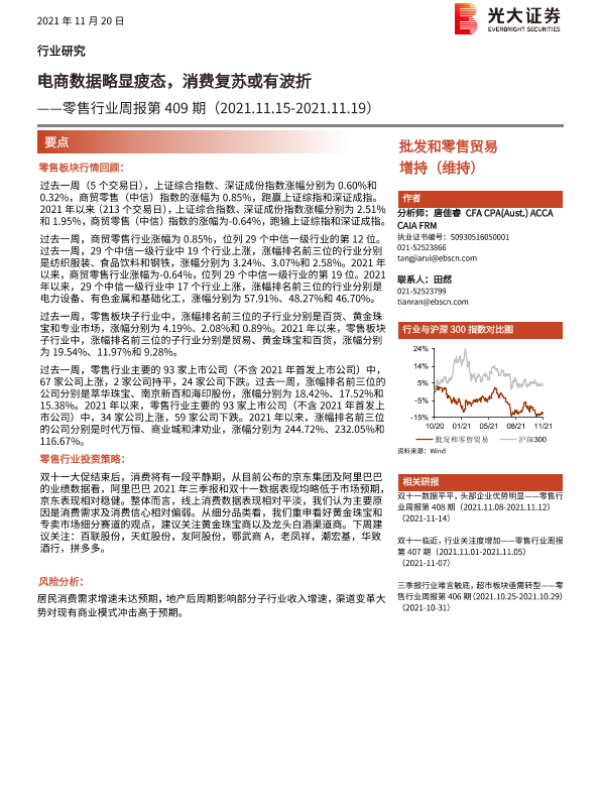 【光大证券】【20211120】零售行业周报第409期:电商数据略显疲态,消费复苏或有波折-8页 行业研究