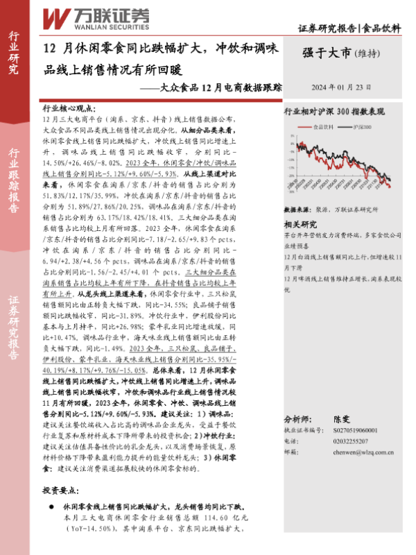 【万联证券】【20240123】12月休闲零食同比跌幅扩大,冲饮和调味品线上销售情况有所回暖-13页 行业研究