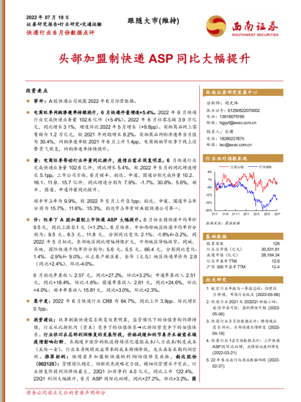 【西南证券】【20220719】快递行业6月份数据点评:头部加盟制快递ASP同比大幅提升-12页 行业研究