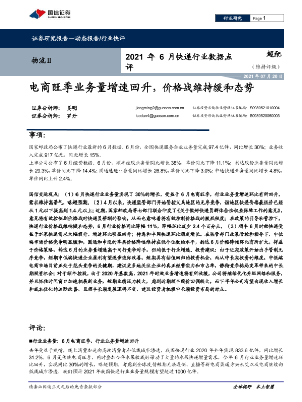 【国信证券】【20210720】2021年6月快递行业数据点评-7页 行业研究