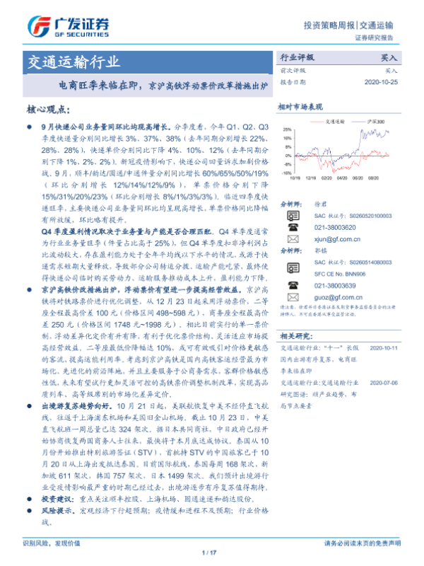 【广发证券】【20201025】电商旺季来临在即,京沪高铁浮动票价改革措施出炉-17页 行业研究