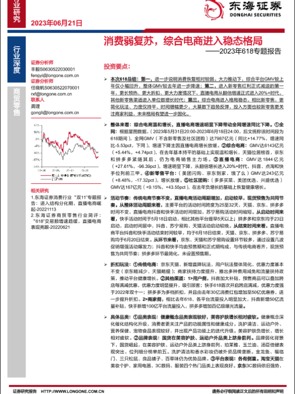 【东海证券】【20230621】商贸零售行业2023年618专题报告:消费弱复苏,综合电商进入稳态格局-18页 行业研究