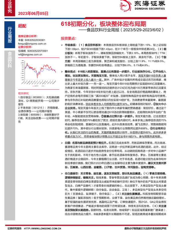 【东海证券】【20230605】20230605-东海证券-食品饮料行业周报:618初期分化,板块整体迎布局期-18页 行业研究