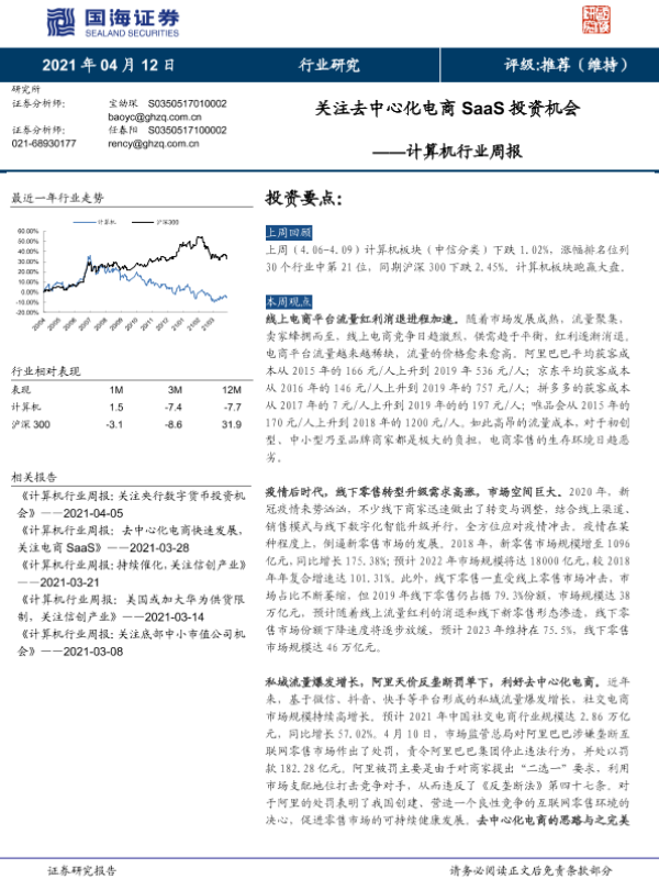 【国海证券】【20210412】计算机行业周报:关注去中心化电商SaaS投资机会-17页 行业研究