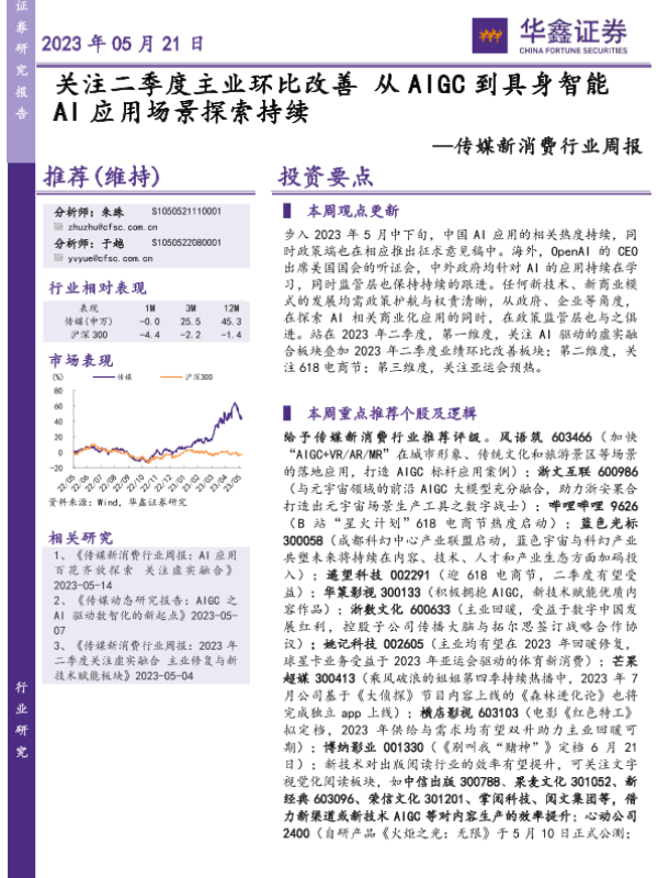 【华鑫证券】【20230521】传媒新消费行业周报:关注二季度主业环比改善 从AIGC到具身智能AI应用场景探索持续-20页 行业研究
