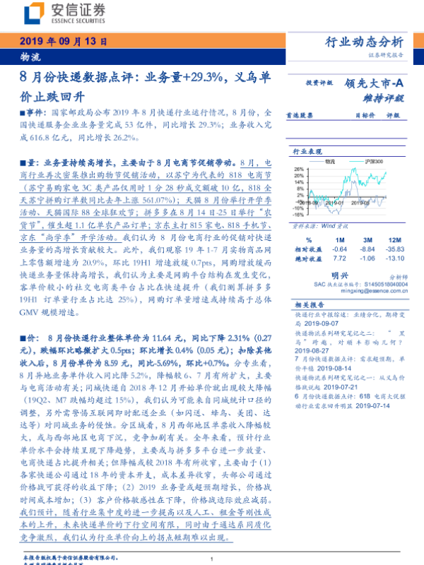 【安信证券】【20190913】8月份快递数据点评:业务量+29.3%,义乌单价止跌回升-10页 行业研究