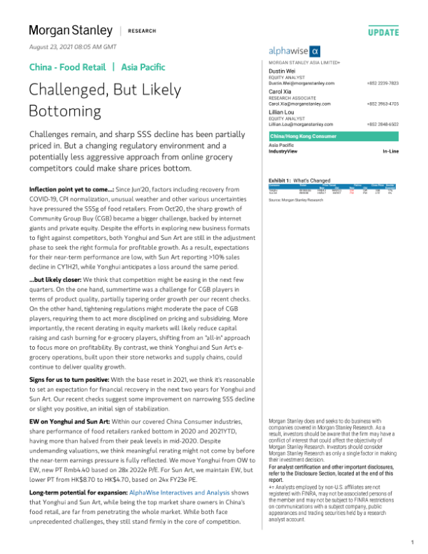 【Morgan Stanley】【20210823】中国食品零售业-面临挑战,但可能正在触底-39页 行业研究
