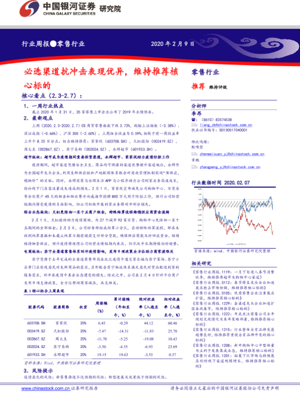 【银河证券】【20200209】零售行业周报:必选渠道抗冲击表现优异,维持推荐核心标的-31页 行业研究