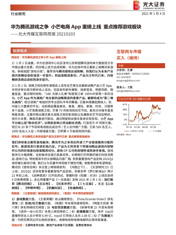 【光大证券】【20210104】光大传媒互联网周报:华为腾讯游戏之争 小芒电商App重磅上线 重点推荐游戏板块-13页 行业研究