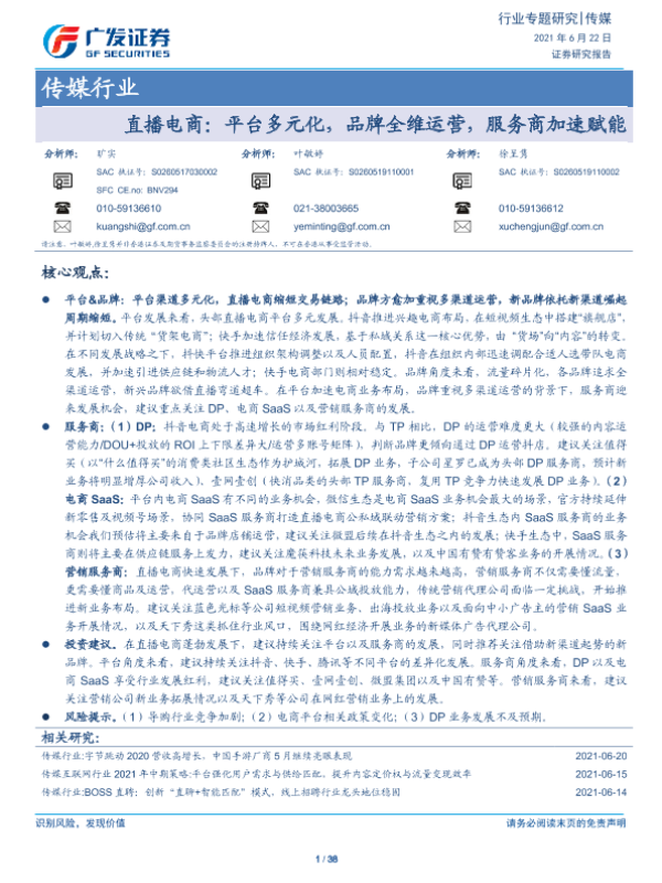【广发证券】【20210622】直播电商:平台多元化,品牌全维运营,服务商加速赋能-38页 行业研究