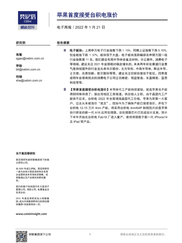 【莫尼塔研究】【20220121】20220121-莫尼塔投资-电子周报:苹果首度接受台积电涨价-6页 行业研究