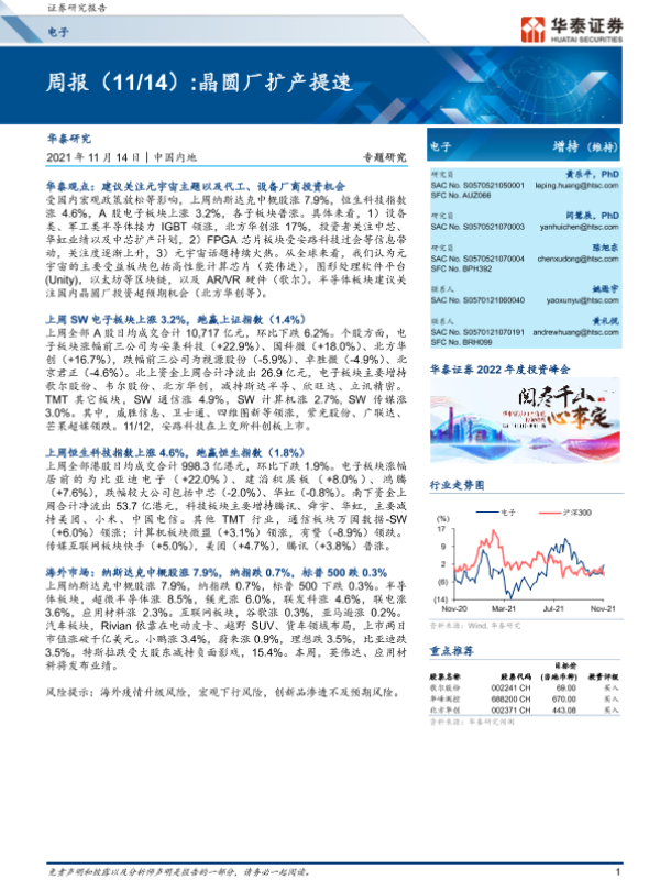 【华泰证券】【20211114】电子周报:晶圆厂扩产提速-16页 行业研究