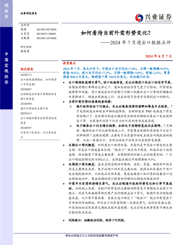 【兴业证券】【20240807】2024年7月进出口数据点评:如何看待当前外需形势变化?-13页 行业研究